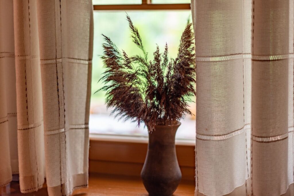 Hang curtains as high as possible and extend beyond the frame to make windows appear larger and ceilings feel taller.